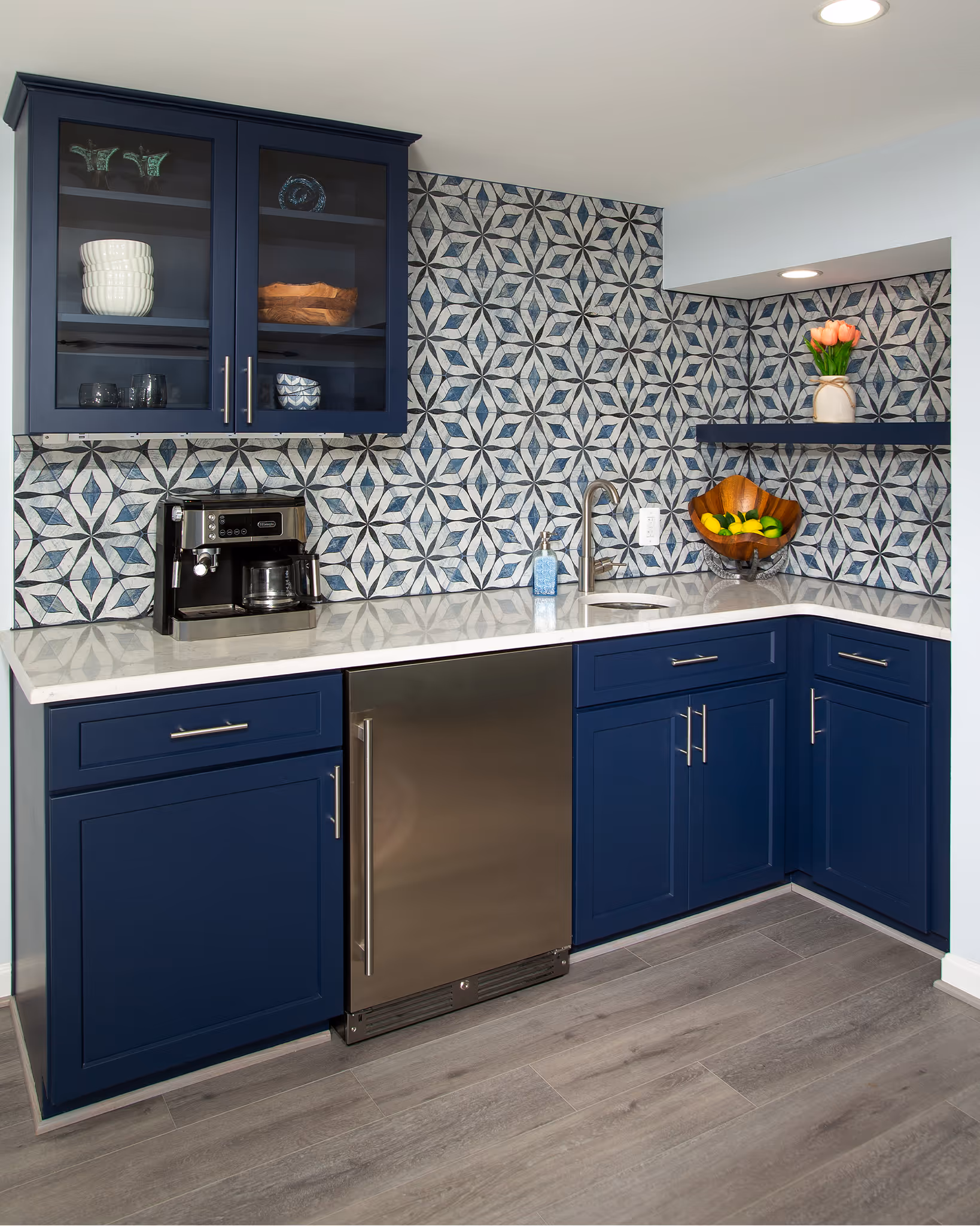 Full-service remodeling with custom cabinetry, quartz countertops, flooring, lighting, and plumbing. Featuring brands like Kraftmaid, Cambria, and Kohler.