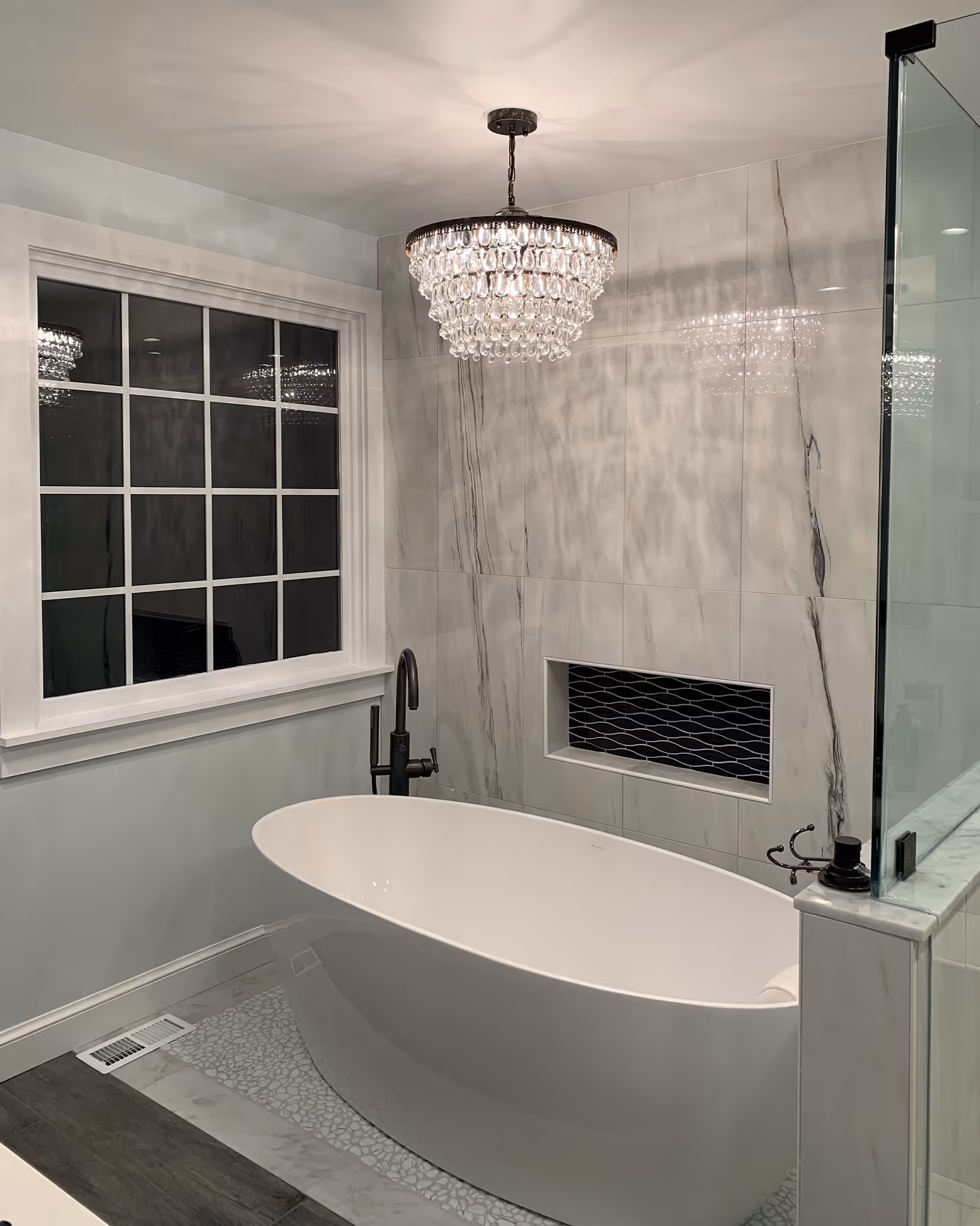Comprehensive bathroom remodeling with cabinetry, countertops, tiling, plumbing, and fixtures using durable materials from Kohler and Silestone.